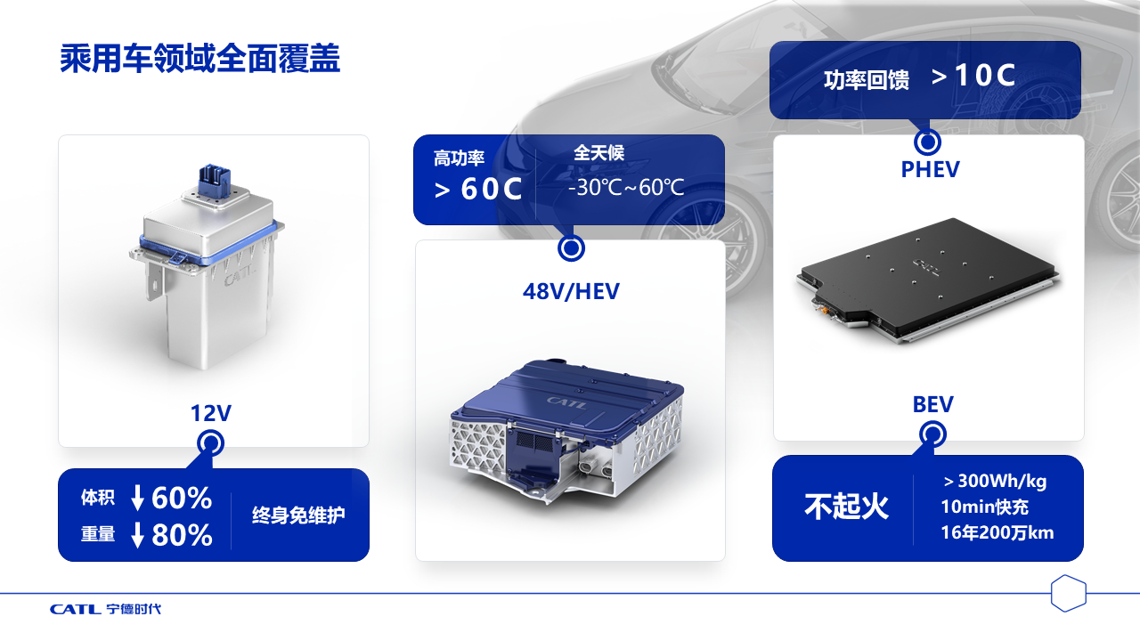 在乘用車(chē)領(lǐng)域,我們開(kāi)發(fā)了12V鋰電池輔助電源,和傳統(tǒng)的鉛酸電池相比重量減少80%、體積減少60%,而且可以終身免維護(hù)。我們開(kāi)發(fā)的48V和HEV用電池包,可以實(shí)現(xiàn)60C的高倍率放電。開(kāi)發(fā)的PHEV電池包,可以實(shí)現(xiàn)10C以上倍率的制動(dòng)能量回收。正在開(kāi)發(fā)的BEV電池包,可以實(shí)現(xiàn)超過(guò)1000km續(xù)航、10分鐘的快速充電、16年200萬(wàn)公里的使用壽命,基本解決消費(fèi)者里程焦慮、充電焦慮和壽命焦慮。