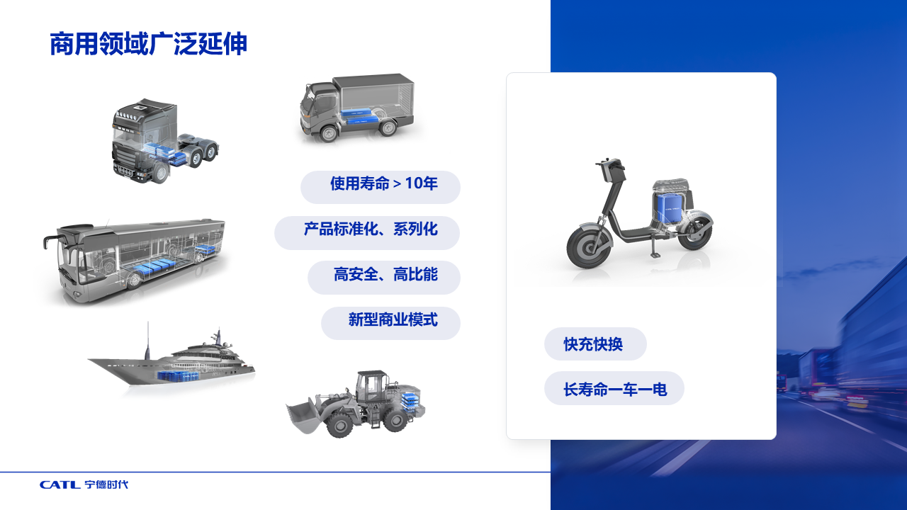 商用領(lǐng)域多數(shù)是生產(chǎn)工具,車(chē)型復(fù)雜多變。針對(duì)這一需求,我們開(kāi)發(fā)了長(zhǎng)壽命電池,保證高強(qiáng)度運(yùn)營(yíng)的質(zhì)保需要。標(biāo)準(zhǔn)化、系列化設(shè)計(jì)的電池包有效提高通用性。和產(chǎn)業(yè)鏈合作伙伴共同推出了車(chē)電分離、電池或整車(chē)租賃等新型商業(yè)模式。我們還發(fā)現(xiàn)家用和外賣(mài)送貨騎手的兩輪車(chē)需求不同,因此設(shè)計(jì)的電池可快充,也可快換,并且電池壽命足夠長(zhǎng),一塊電池可以服務(wù)車(chē)輛全生命周期,節(jié)省了更換電池的成本。