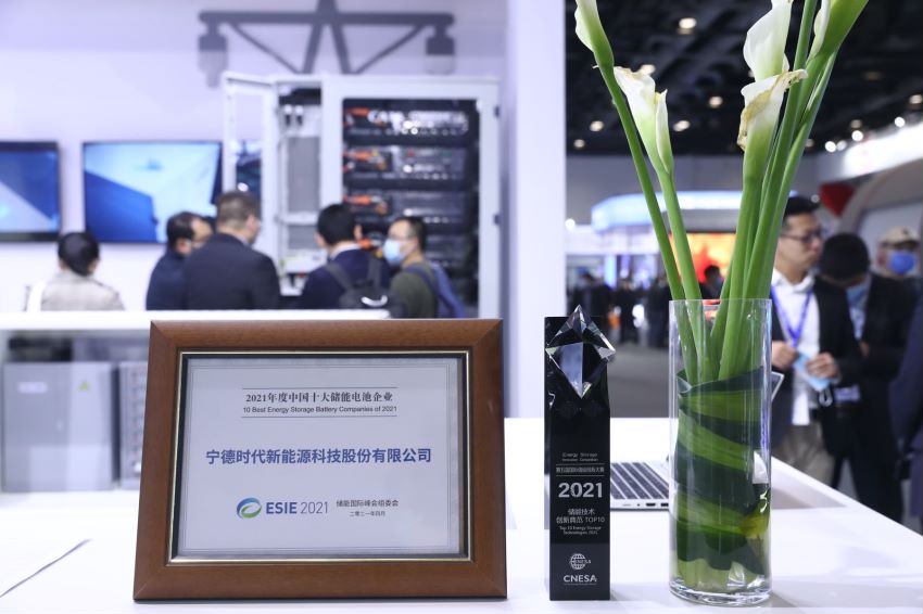 展會(huì)期間,在由國(guó)際儲(chǔ)能技術(shù)與產(chǎn)業(yè)聯(lián)盟主辦的 “第五屆國(guó)際儲(chǔ)能創(chuàng)新大賽”中,寧德時(shí)代憑借創(chuàng)新型戶(hù)外液冷電柜產(chǎn)品榮獲“2021儲(chǔ)能技術(shù)創(chuàng)新典范TOP10”獎(jiǎng)項(xiàng),同時(shí)被授予“中國(guó)十大儲(chǔ)能電池企業(yè)”的榮譽(yù)稱(chēng)號(hào)。